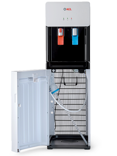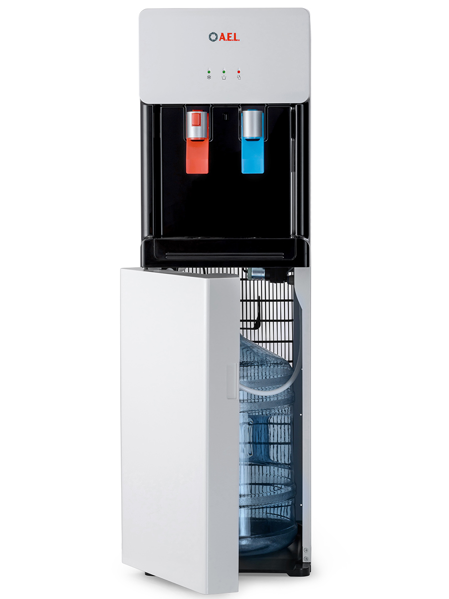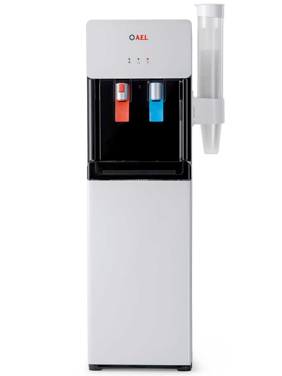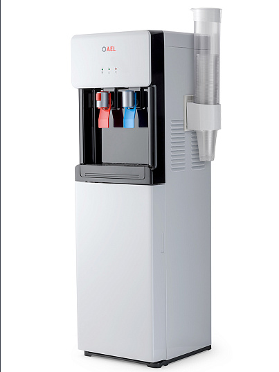 Компрессорный кулер с удобной нижней загрузкой бутыли. Основные части кулера выполнены из пластика, а боковые стенки из металла, что позволяет прикрепить держатель для стаканов на магните. На боковых стенках имеются технические отверстия и для крепления держателей на шурупах. Длинные удобные PUSH-краны с защитой от случайного нажатия на горячем кране.