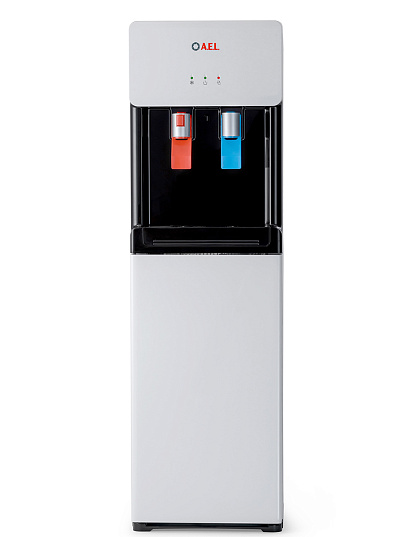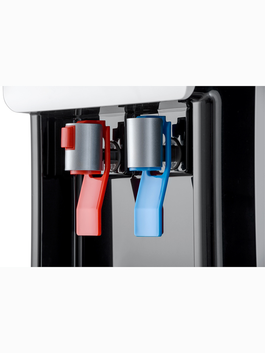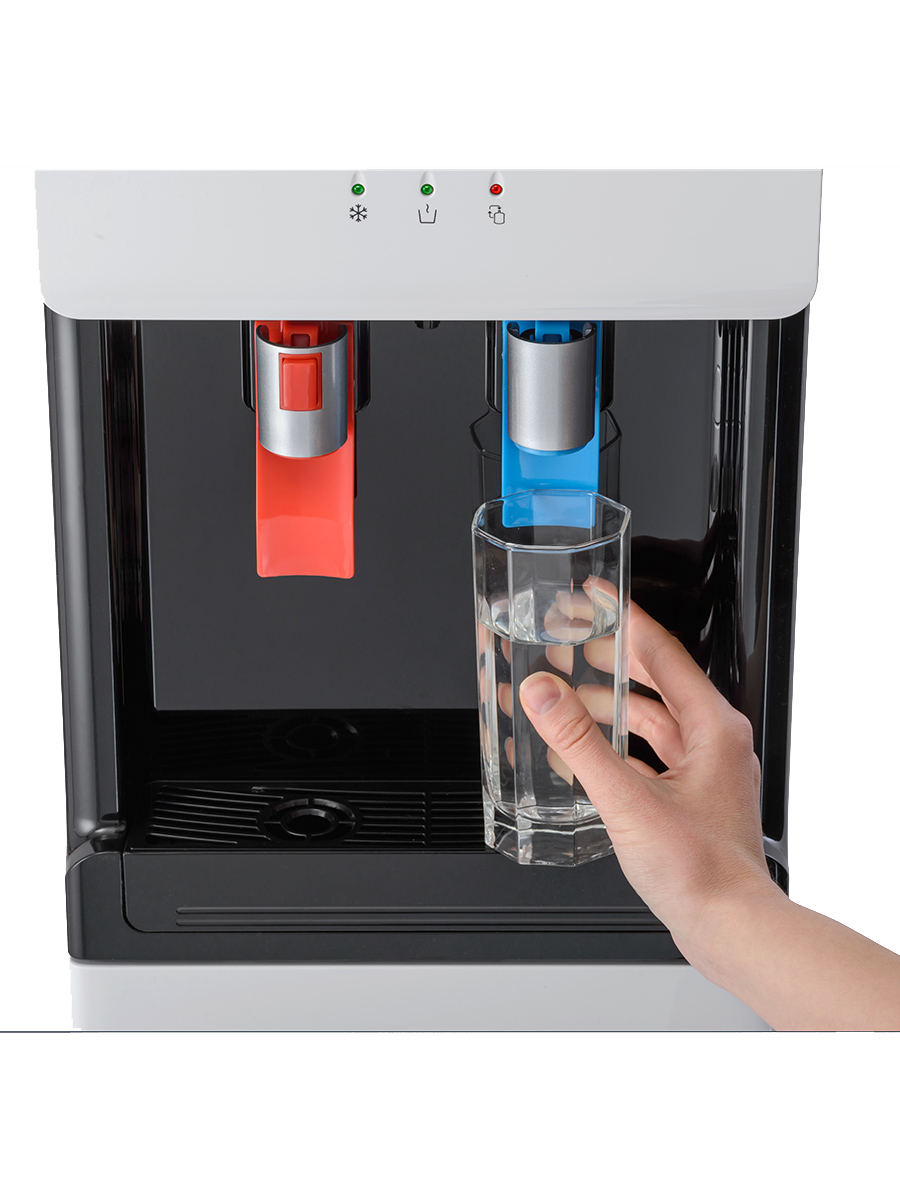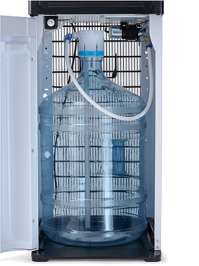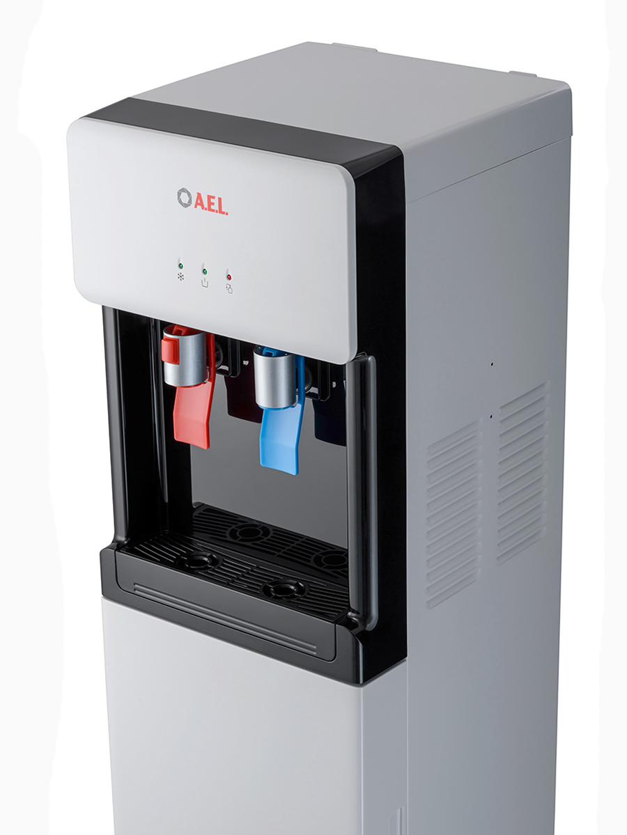 Компрессорный кулер с удобной нижней загрузкой бутыли. Основные части кулера выполнены из пластика, а боковые стенки из металла, что позволяет прикрепить держатель для стаканов на магните. На боковых стенках имеются технические отверстия и для крепления держателей на шурупах. Длинные удобные PUSH-краны с защитой от случайного нажатия на горячем кране.