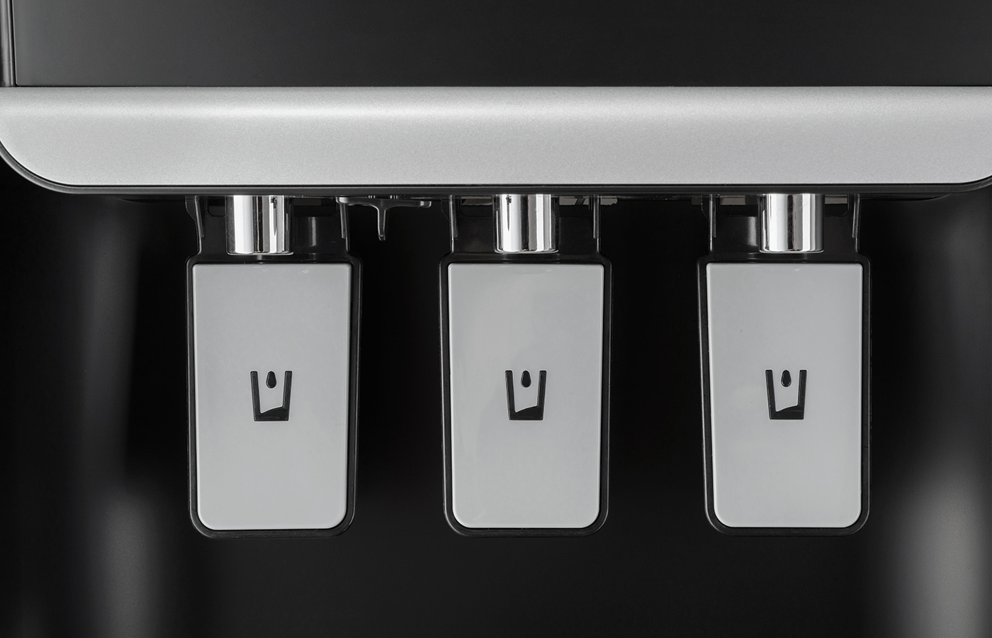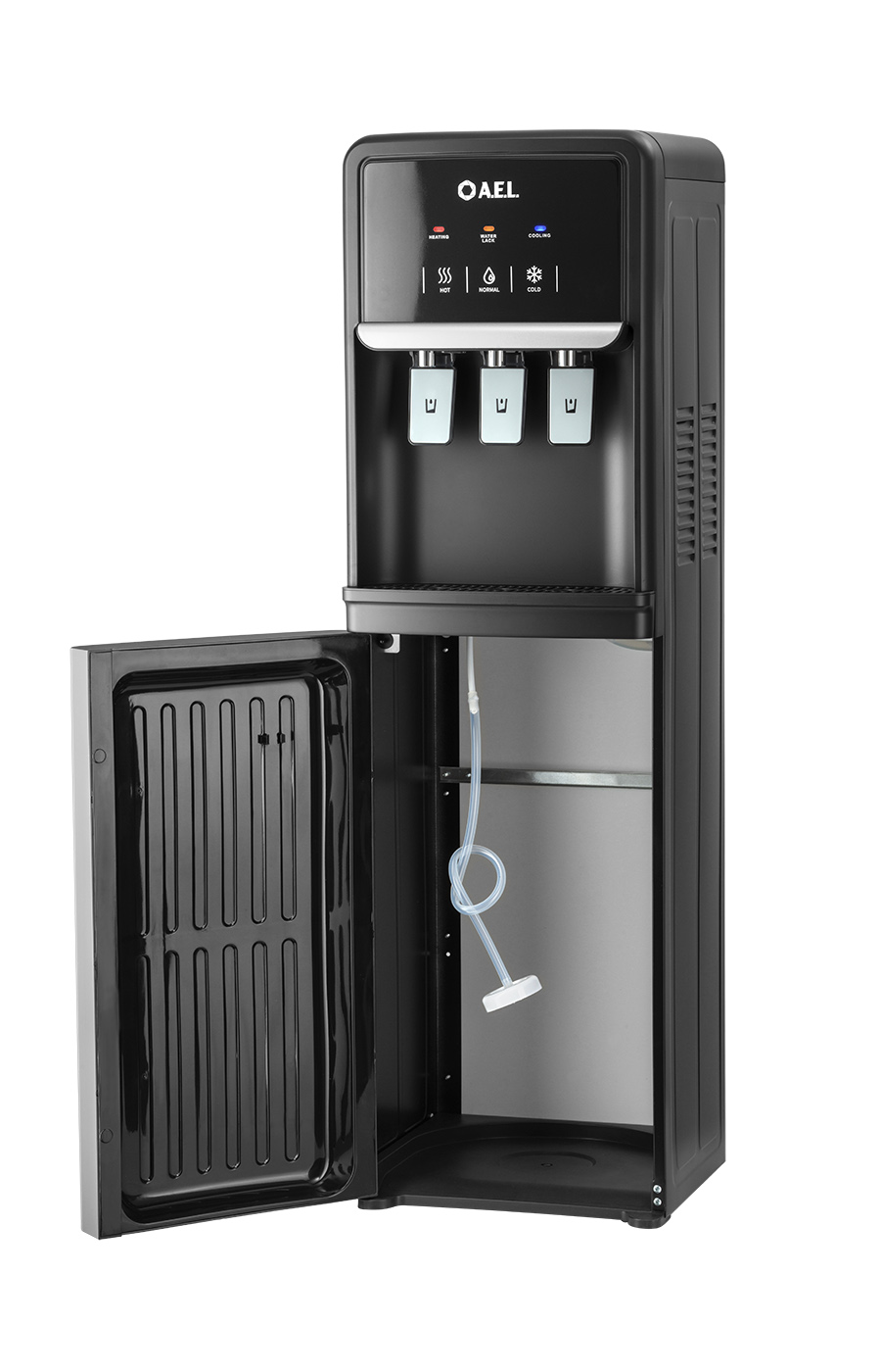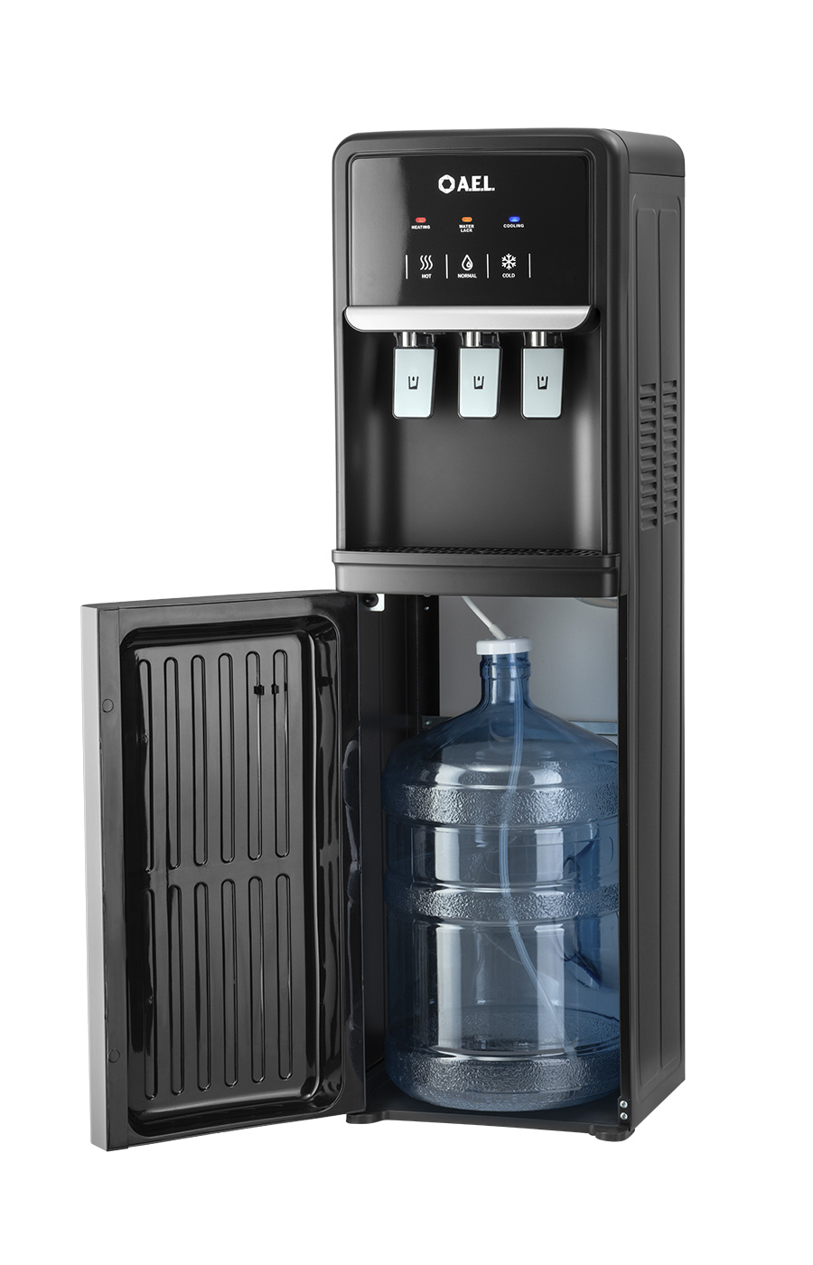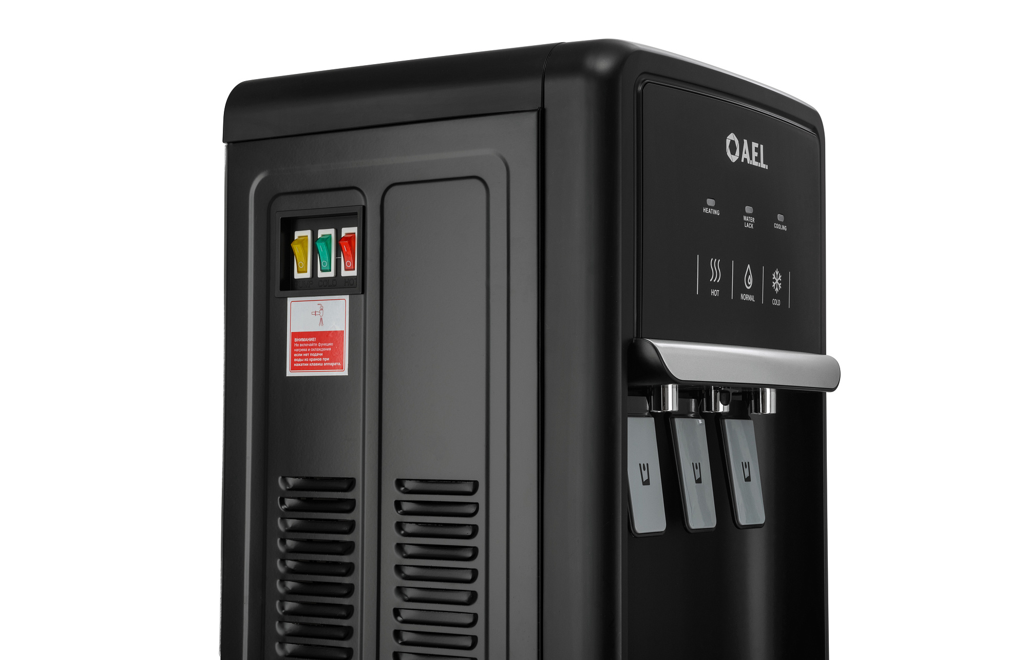 Кулер для воды LD-AEL-815a black с нижней загрузкой бутыли и с электронным охлаждением. Три крана нажим чашкой с защитой от случайного нажатия на горячей воде. Горячая/прохладная/холодная вода на выходе. В комплект входит силиконовая трубка забора воды, которая находится внутри нижнего отсека, позволяет полностью набрать всю воду из бутыли.