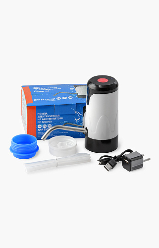 Комплектация: помпа, адаптер на бутыль 5л с горлышком 48мм, адаптер на 220В, usb кабель, трубка забора воды, носик для помпы, инструкция.