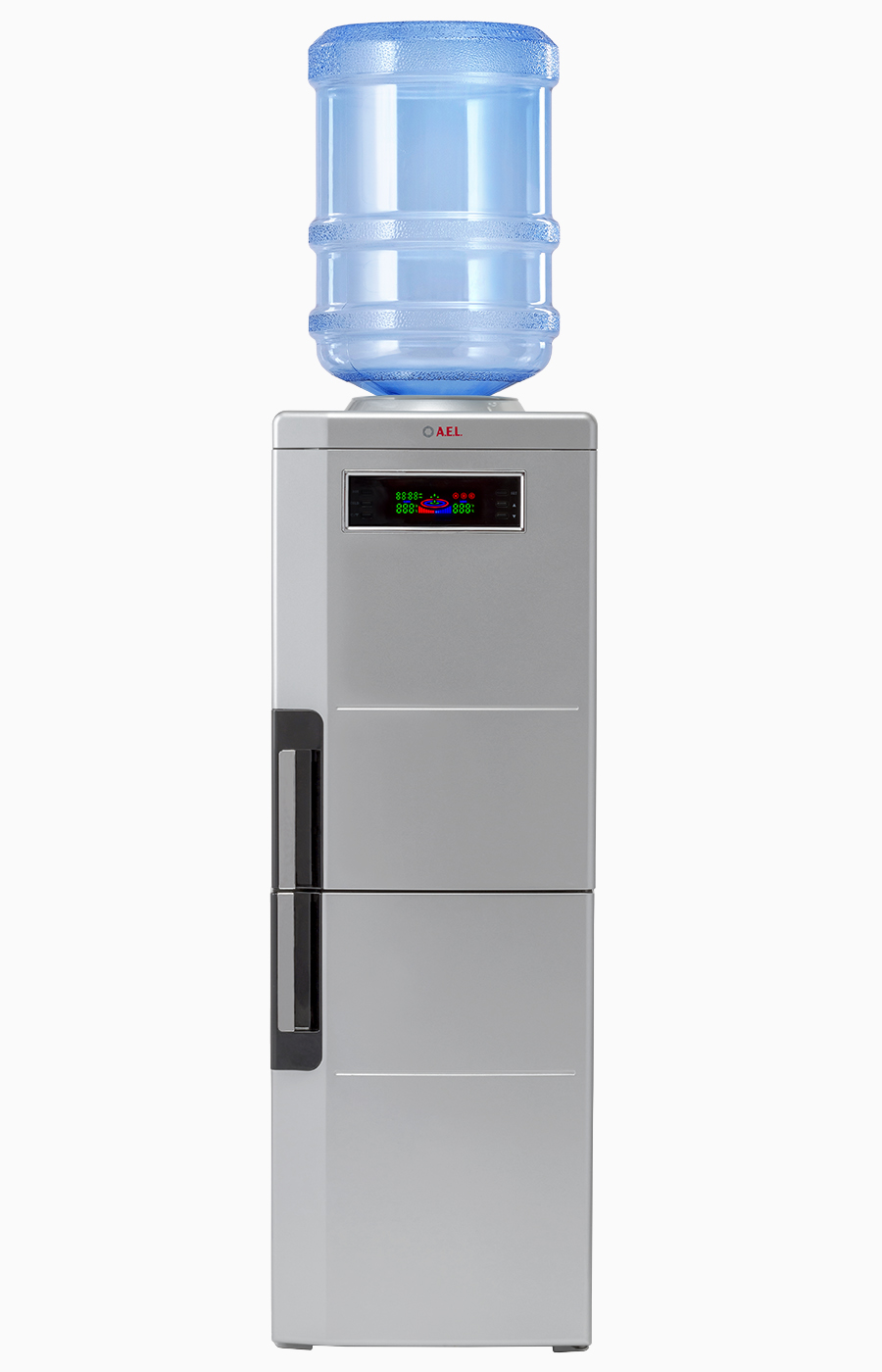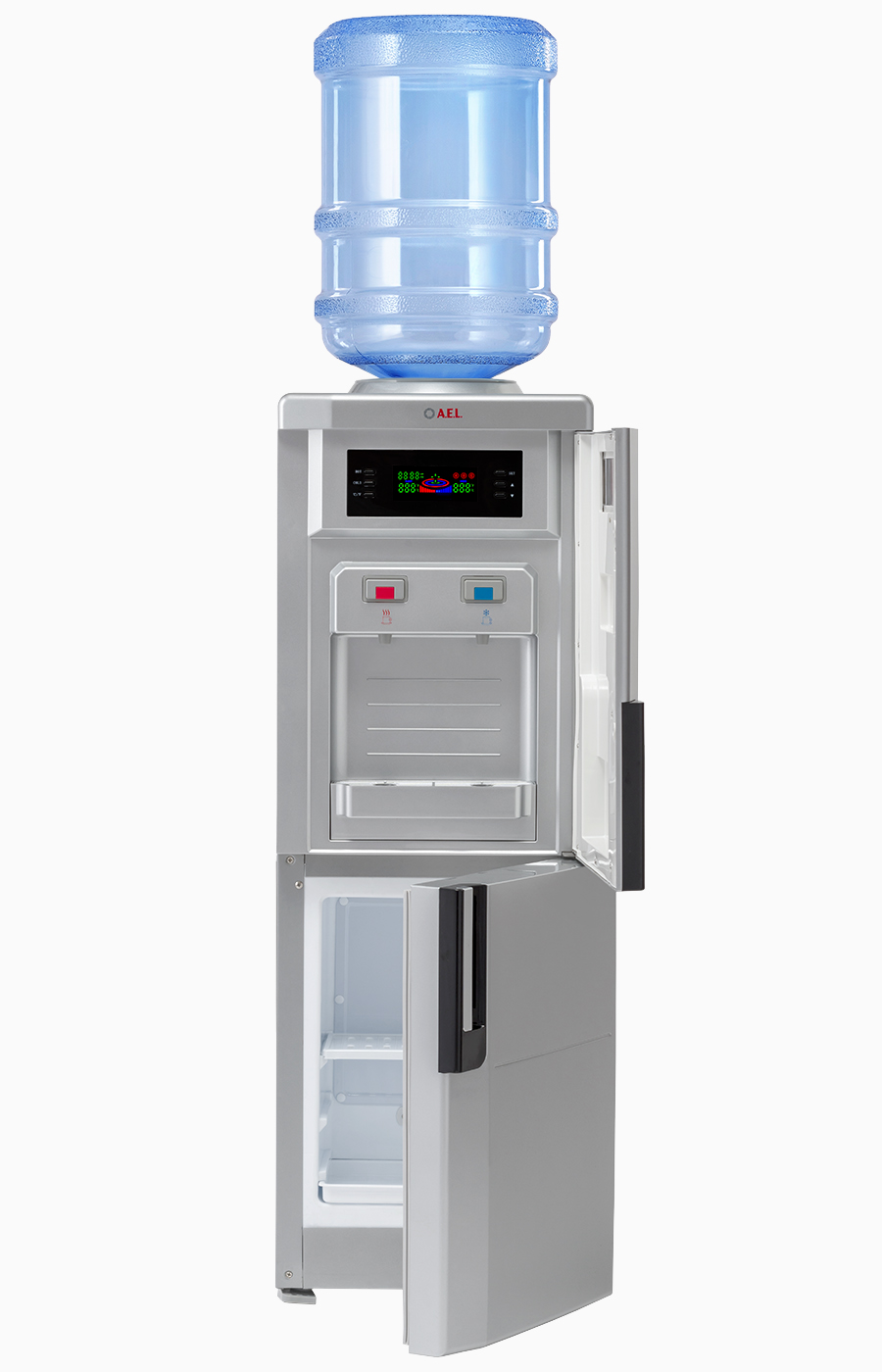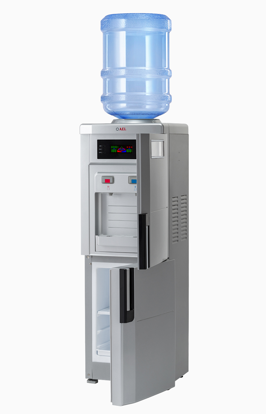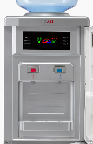 Презентабельная модель напольного кулера с компрессорным охлаждением.Корпус выполнен в серебристом цвете с дисплеем, показывающим параметры работы устройства. Краны-клавиши закрыты дверцей. Кулер оснащен холодильной камерой на 12 л для хранения продуктов и дверкой, закрывающей рабочую зону клавиш подачи горячей и холодной воды.