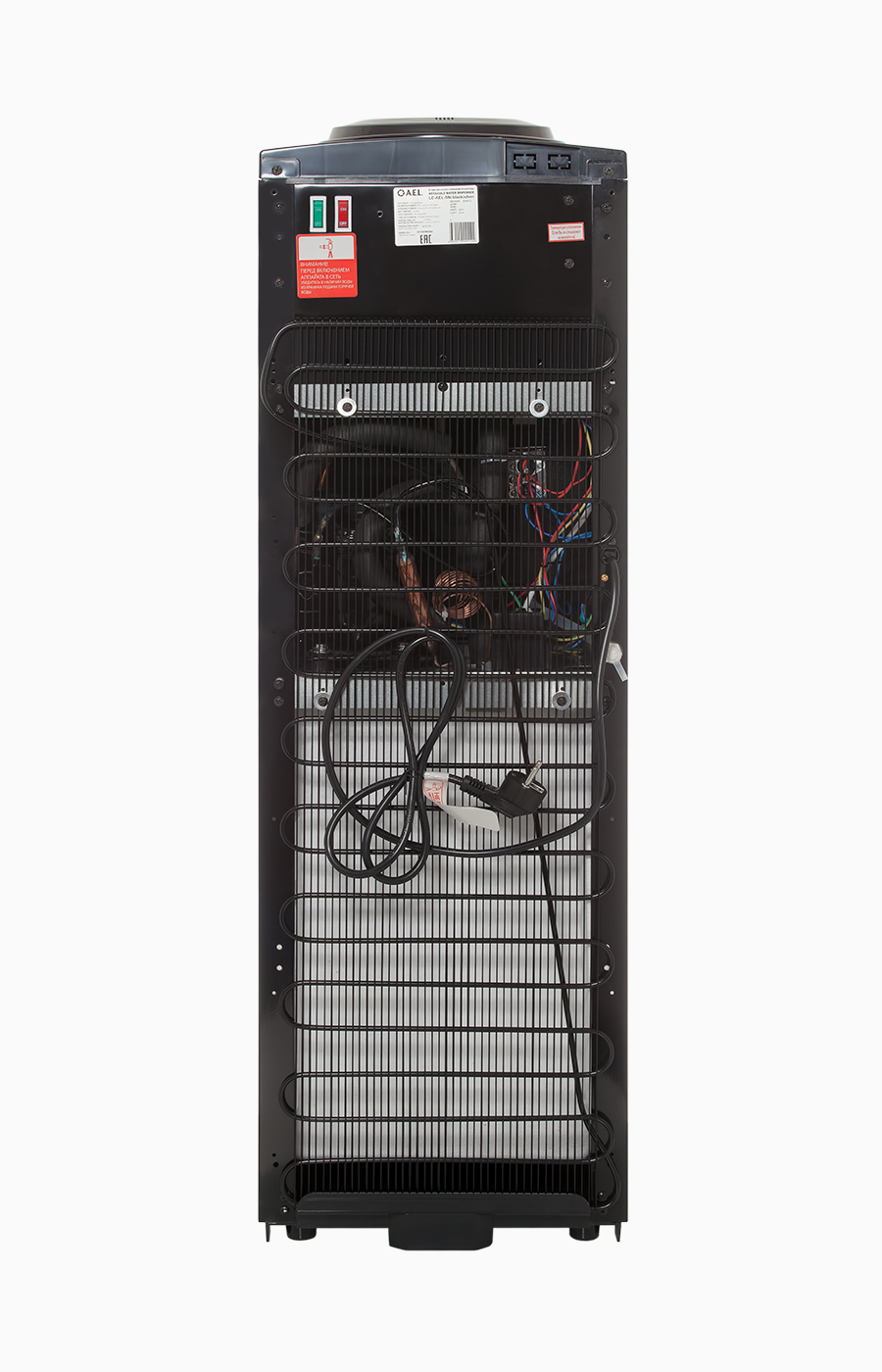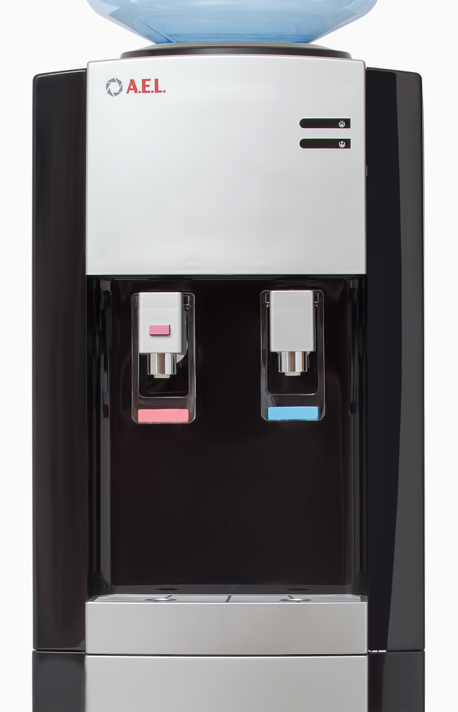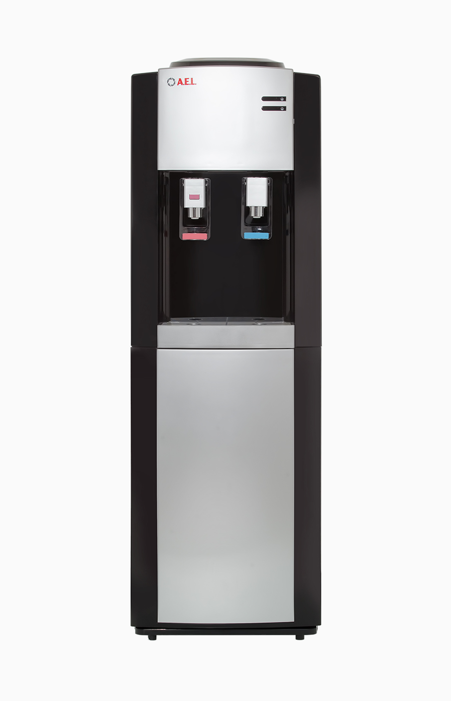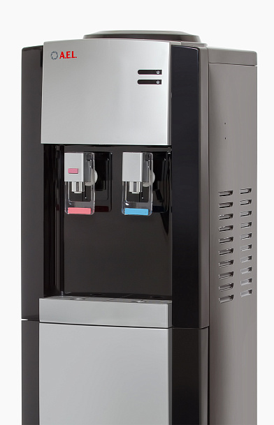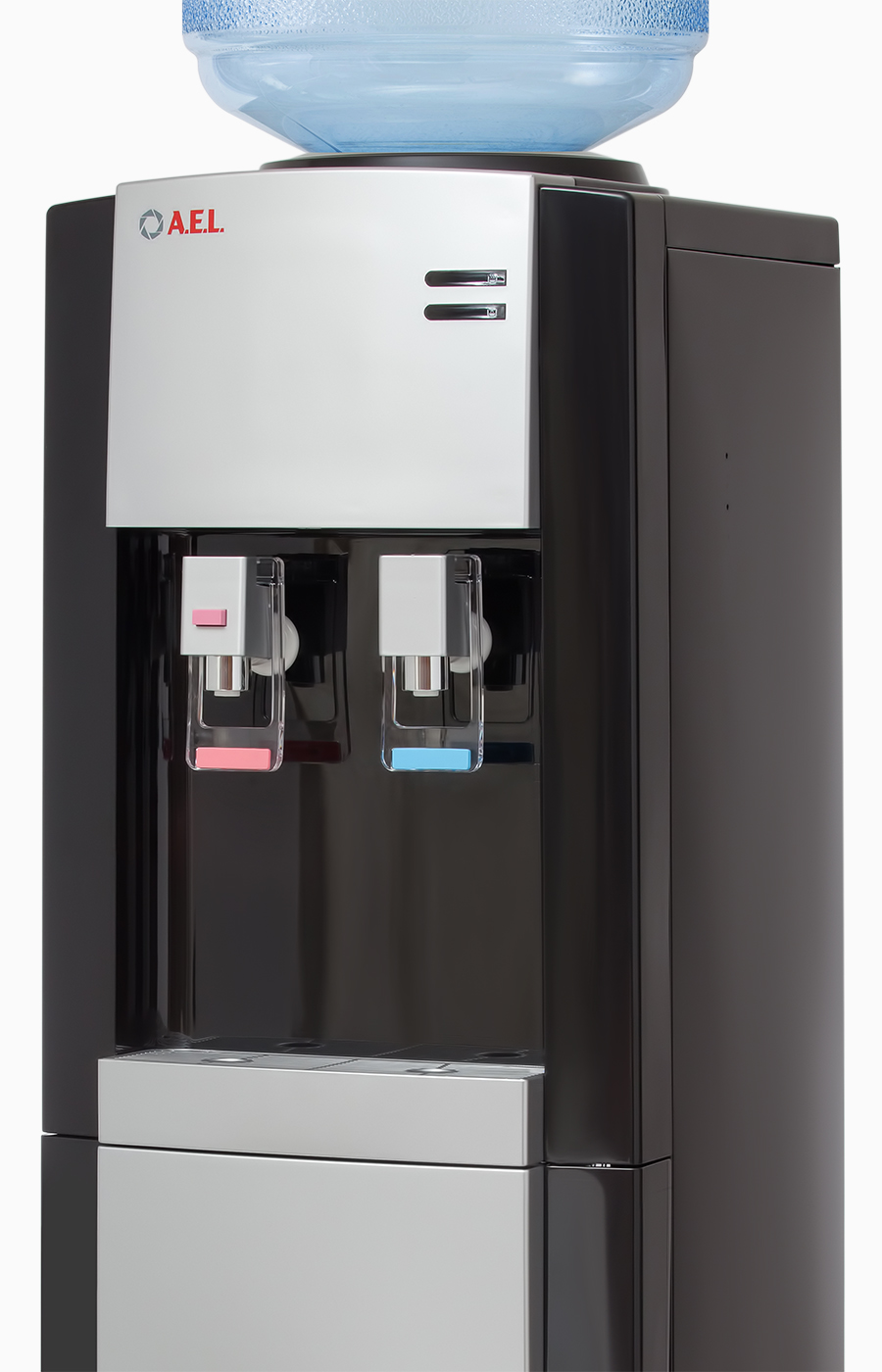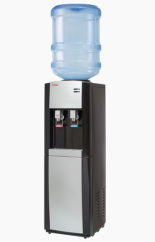 Новинка. Напольный кулер с компрессорным охлаждением черного цвета с сереберистой вставкой на лицевой панели и лотком. Верхняя загрузка бутыли. Удобные краники "нажим кружкой" с внутренней резьбой, которые при необходимости легко и быстро заменить. Кран горячей воды оснащен кнопкой-защитой от случайного нажатия.