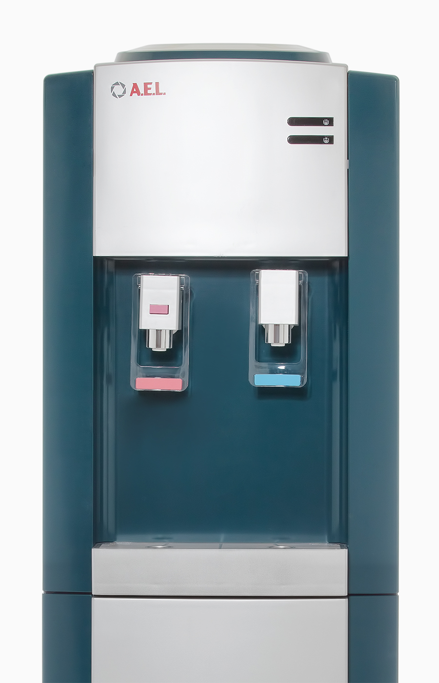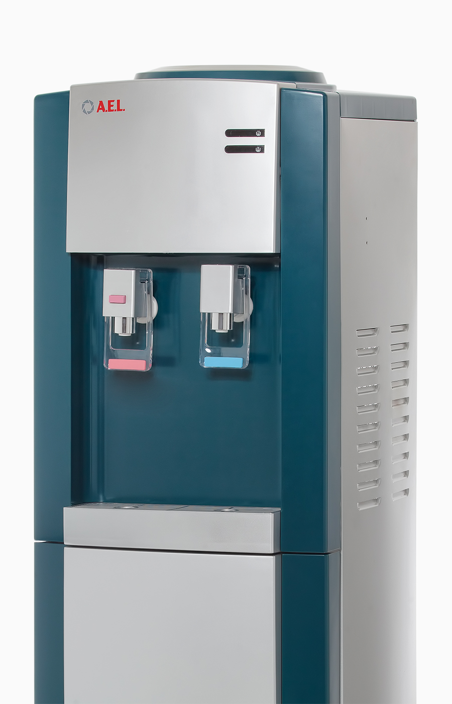 Новинка. Напольный кулер с компрессорным охлаждением цвета маренго с сереберистой вставкой на лицевой панели и лотком. Верхняя загрузка бутыли. Удобные краники "нажим кружкой" с внутренней резьбой, которые при необходимости легко и быстро заменить. Кран горячей воды оснащен кнопкой-защитой от случайного нажатия.