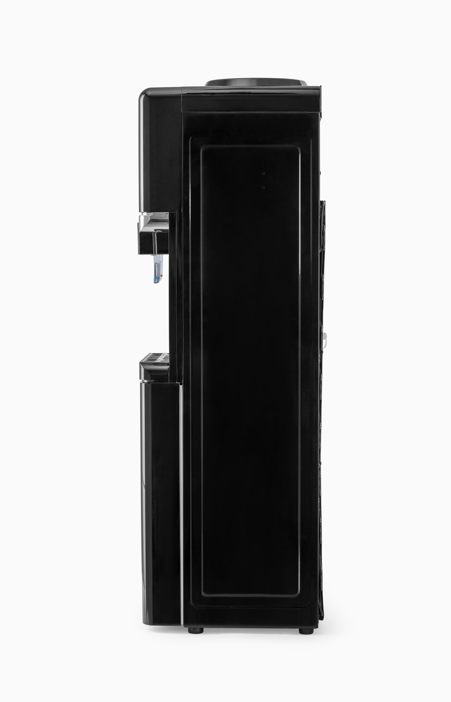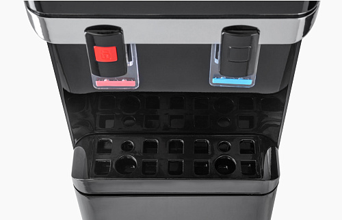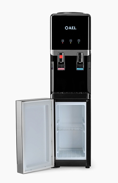 Новинка - напольный кулер с компрессорным охлаждением черного цвета с металлической вставкой. Верхняя загрузка бутыли, шкафчик 11л для хранения чая, кофе, стаканчиков и т.п. Удобные краники "нажим кружкой". Кран горячей воды с кнопкой-защитой от случайного нажатия. Широкий лоток для сбора капель.
