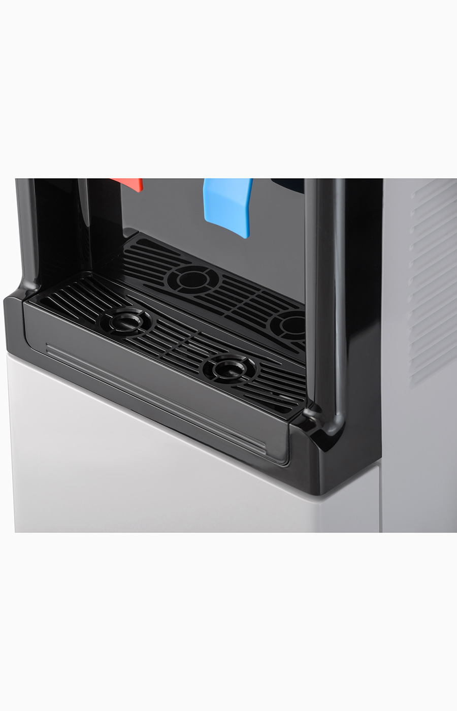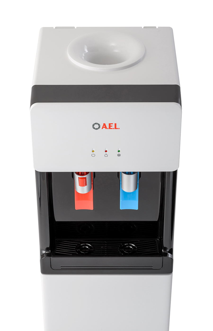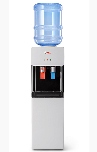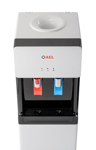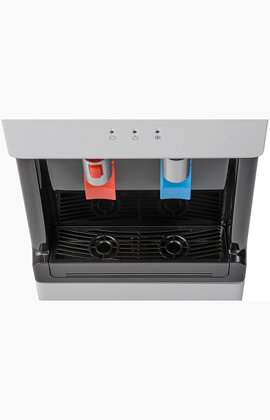 Компрессорный кулер с верхней загрузкой бутыли. Основные части выполнены из пластика, а боковые стенки из металла, что позволяет прикрепить держатель для стаканов на магните. На боковых стенках имеются технические отверстия и для крепления держателей на шурупах. Длинные удобные PUSH-краны с защитой от случайного нажатия на горячем кране. Широкий лоток для сбора капель.