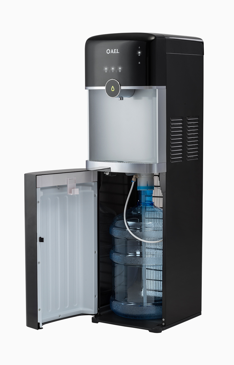 Новинка с нижней загрузкой бутыли с сенсорной панелью управления. Подача и выбор воды осуществляется путем легкого прикосновения на панель управления. Для того чтобы налить холодную воду в стакан необходимо сначала нажать сенсорную клавишу холодной воды, затем клавишу с каплей. При нажатии клавиша "капля" будет подсвечиваться. Для остановки потока холодной воды из крана нужно нажать сенсорную клавишу "капля" повторно. Нижняя загрузка бутыли. Цвет черный с серебряной вставкой. Три сенсора на передней панели (горячая/прохладная/холодная). Подсветка сенсорных клавиш при нажатии. В процессе эксплуатации аппарата в тот момент, когда вода в бутыли закончилась, на панели индикации загорится индикатор наличия воды в бутыли. Это символизирует о том, что необходимо заменить пустую бутыль.