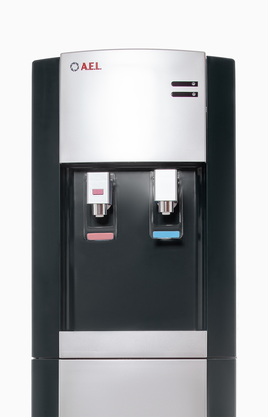 Представляем новинку, модель пурифайера с электронным охлаждением с черными боковыми стенками, черным корпусом и серебряными вставками;