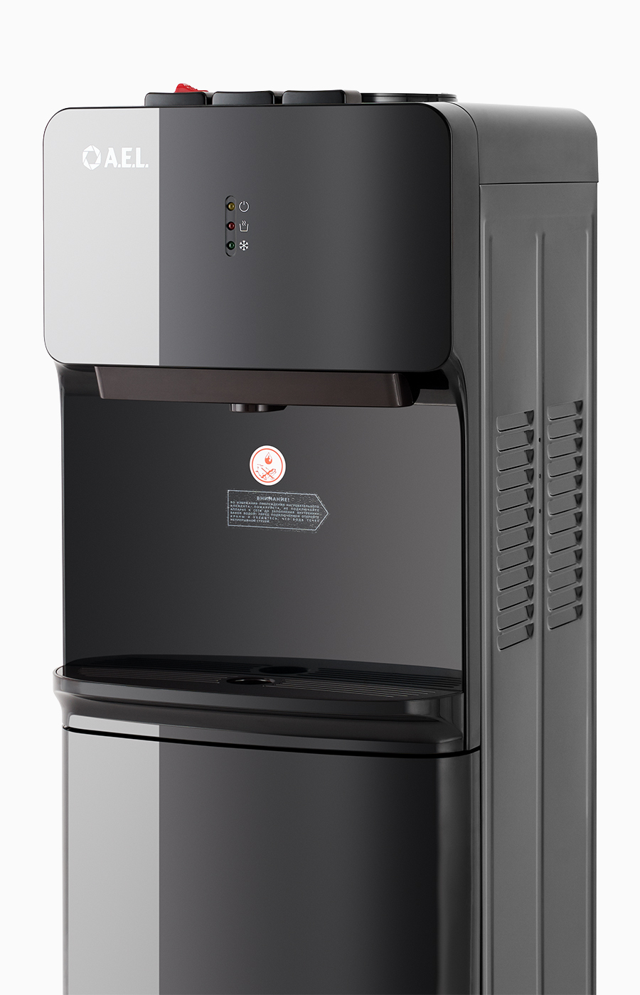 Напольный кулер с верхней загрузкой бутыли с компрессорным охлаждением черного цвета, глянцевый. Высота кулера 930мм позволяет комфортно нажимать на три клавиши, одна из которых - горячей воды - имеет защиту от случайного нажатия. Цвет: черный глянец.