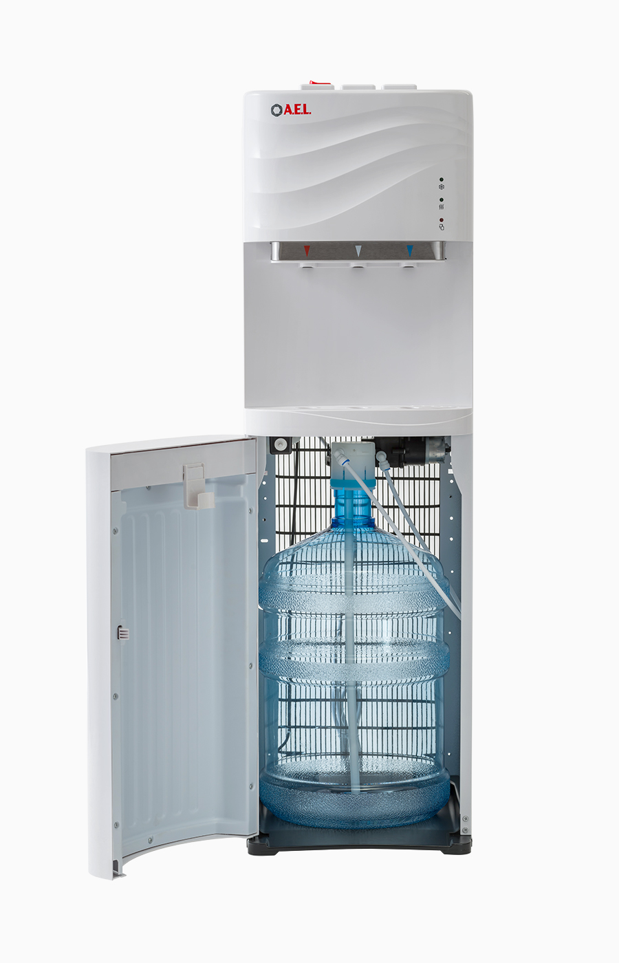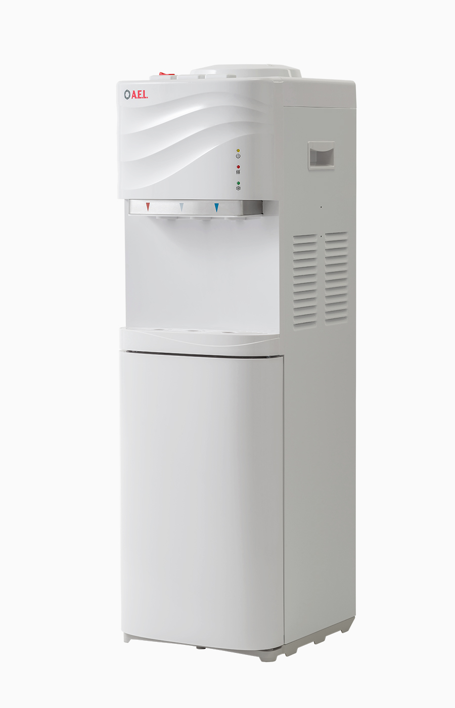 Новый кулер с нижней загрузкой бутыли белого цвета. После снятия крышки с бутыли Вам не надо поднимать её наверх. Просто установите трубку забора воды на бутыль и задвиньте внутрь шкафчика кулера. Оригинальный дизайн кулера с волной на лицевой панели выделяет этот кулер из всех аналогичных по техническим характеристикам. Снабжен 3-мя краниками-клавишами (горячая/прохладная/холодная).В процессе эксплуатации аппарата в тот момент, когда вода в бутыли закончилась, на панели индикации загорится индикатор наличия воды в бутыли. Это символизирует о том, что необходимо заменить пустую бутыль.
