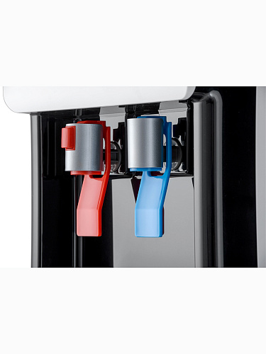 Компрессорный кулер с удобной нижней загрузкой бутыли. Основные части кулера выполнены из пластика, а боковые стенки из металла, что позволяет прикрепить держатель для стаканов на магните. На боковых стенках имеются технические отверстия и для крепления держателей на шурупах. Длинные удобные PUSH-краны с защитой от случайного нажатия на горячем кране.