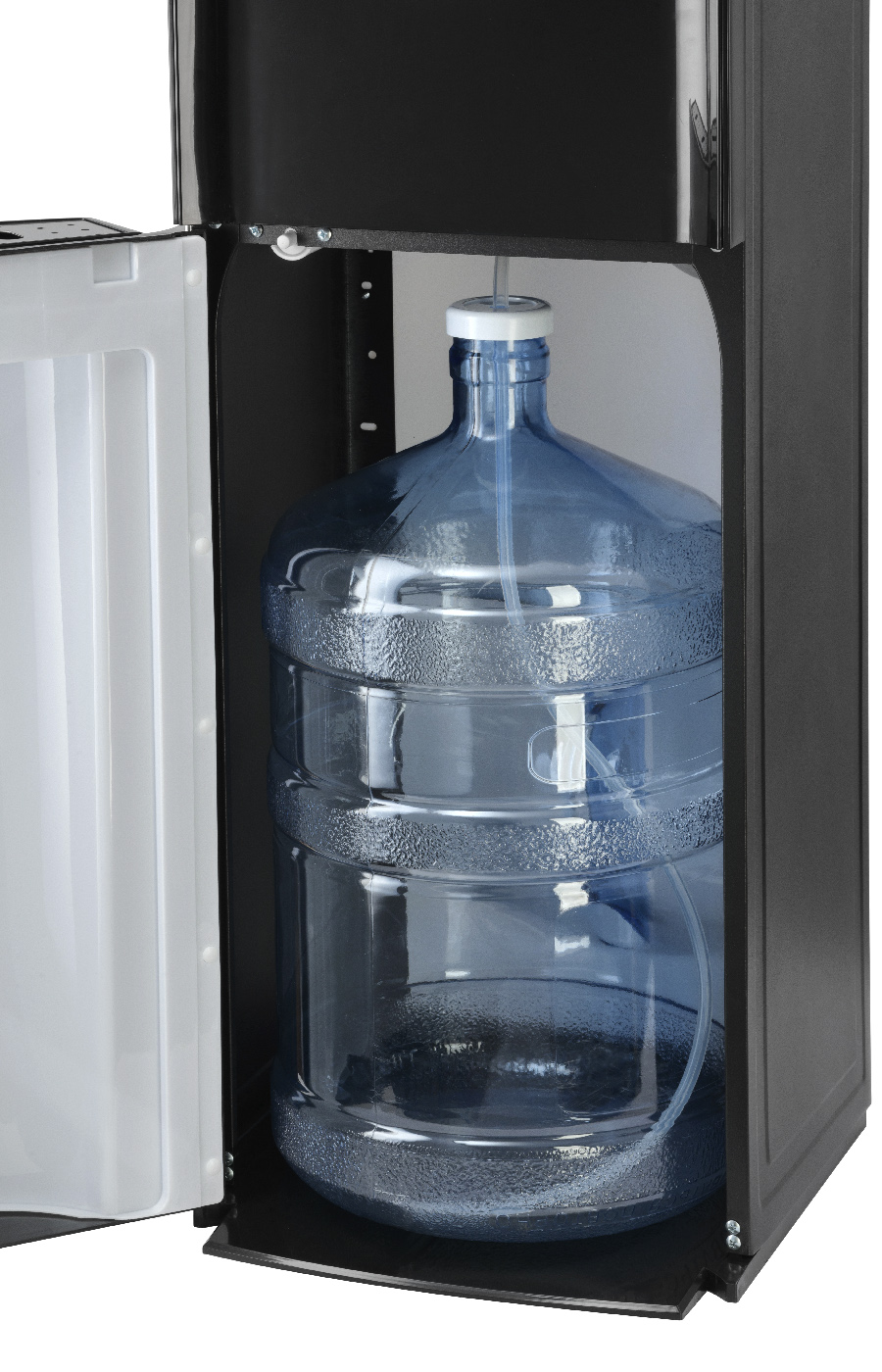 Для подачи воды нужно повернуть кран, для остановки подачи — вернуть его в исходное положение. Корпус полностью черного цвета. В процессе эксплуатации аппарата в тот момент, когда вода в бутыли закончилась, раздаётся звуковой сигнал. Это символизирует о том, что необходимо заменить пустую бутыль.