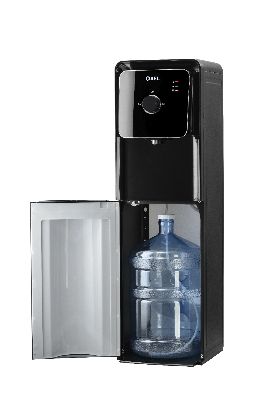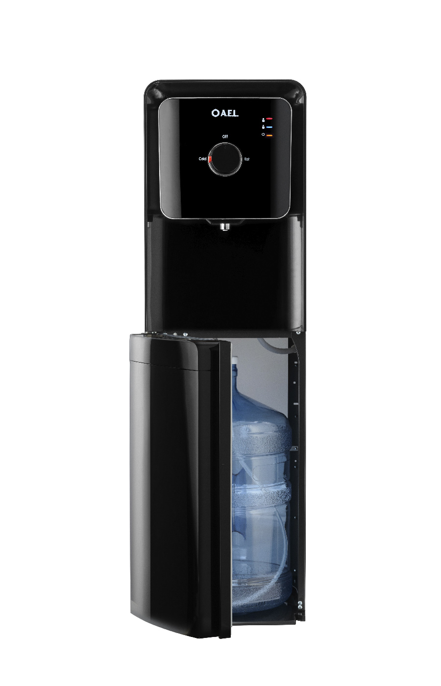 Новинка в ассортименте АЕЛ - напольный кулер с нижней загрузкой бутыли, электронное охлаждение с поворотным краном. Раздача воды горячей и холодной температуры.