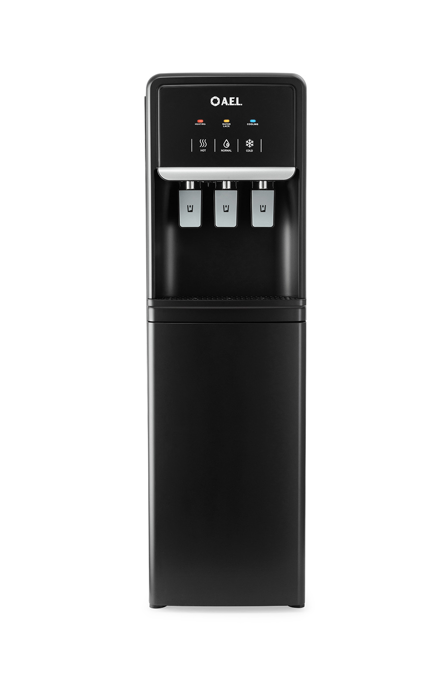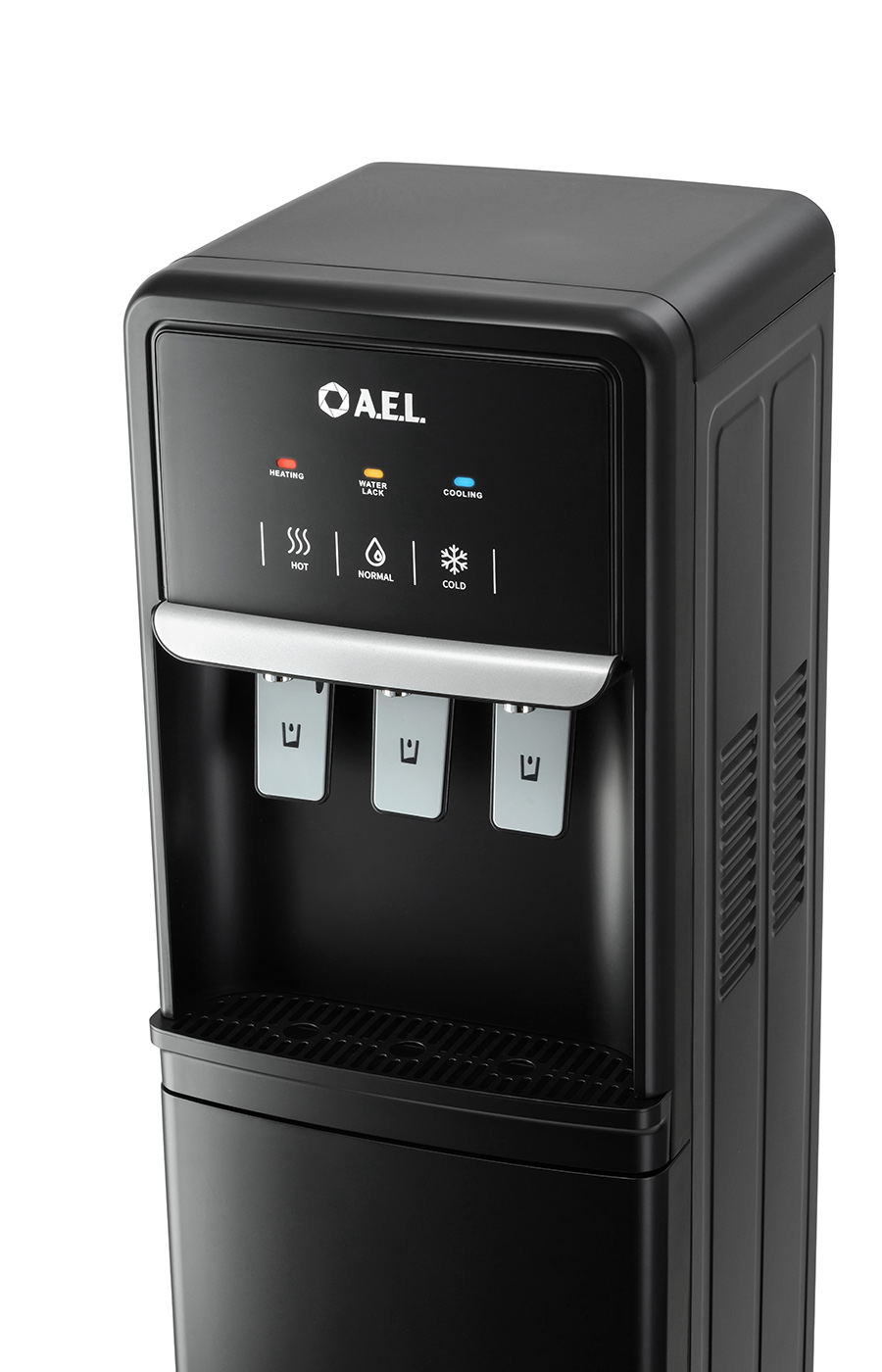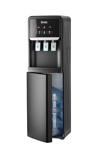 Кулер для воды LD-AEL-815a black с нижней загрузкой бутыли и с электронным охлаждением. Три крана нажим чашкой с защитой от случайного нажатия на горячей воде. Горячая/прохладная/холодная вода на выходе. В комплект входит силиконовая трубка забора воды, которая находится внутри нижнего отсека, позволяет полностью набрать всю воду из бутыли.