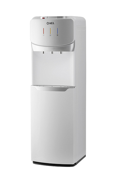 Кулер для воды LD-AEL-819a white/silver с нижней загрузкой бутыли и с электронным охлаждением. Три клавиши с защитой от случайного нажатия на горячей воде. Горячая/комнатная/холодная вода на выходе. Цвет белый глянец с серебристой вставкой.