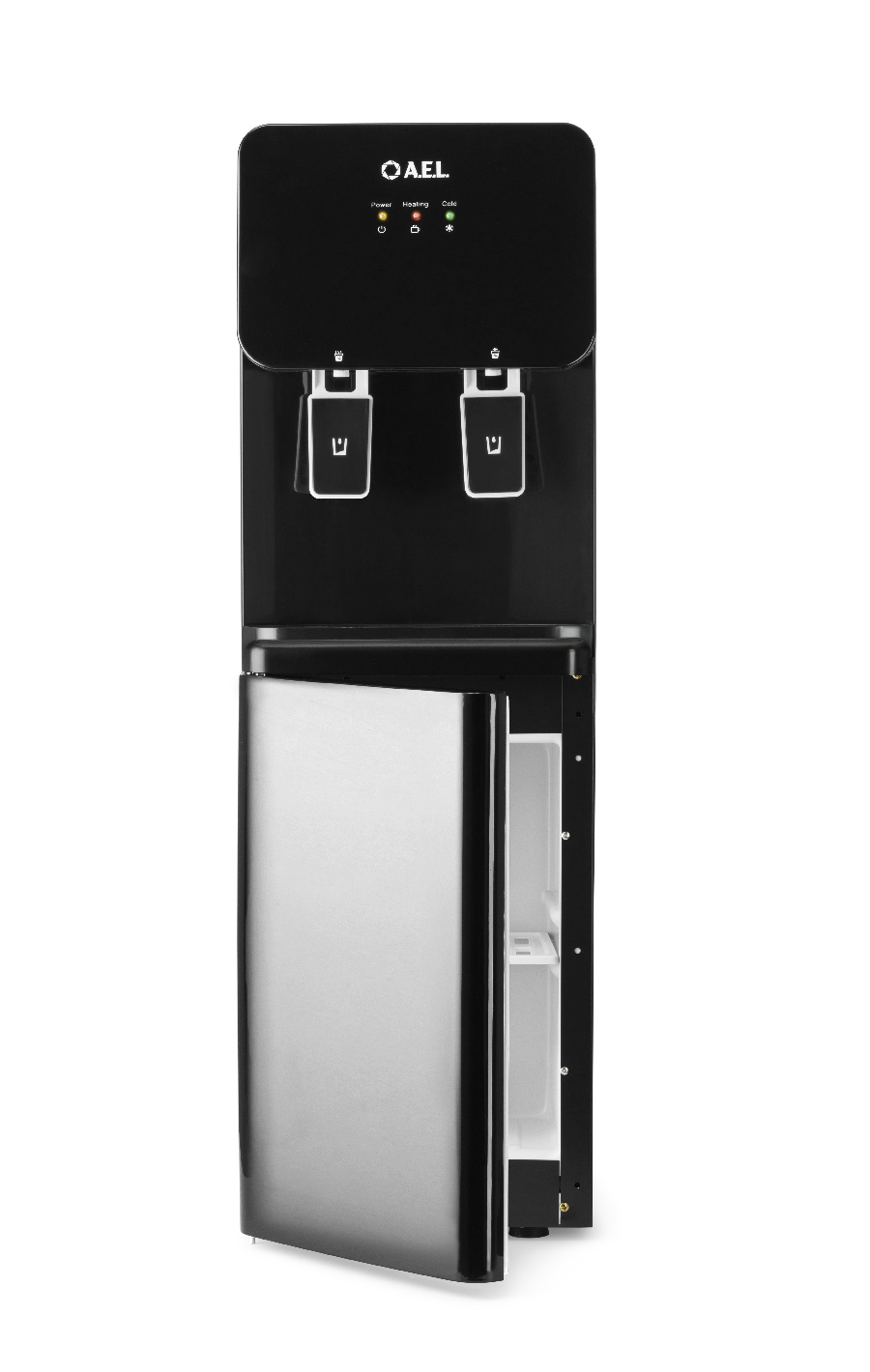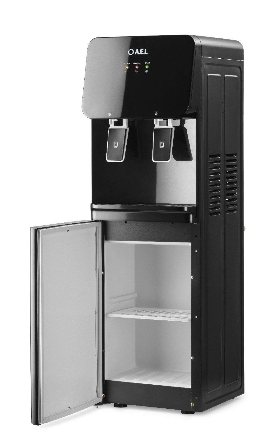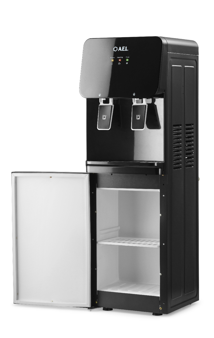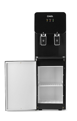Напольный кулер с электронным охлаждением, нагревом и шкафчиком для продуктов. Гладкая черная лицевая панель, удобные краны "нажим чашкой" и малые габариты аппарата эргономично впишутся в Ваш офис. Цвет черный глянец.