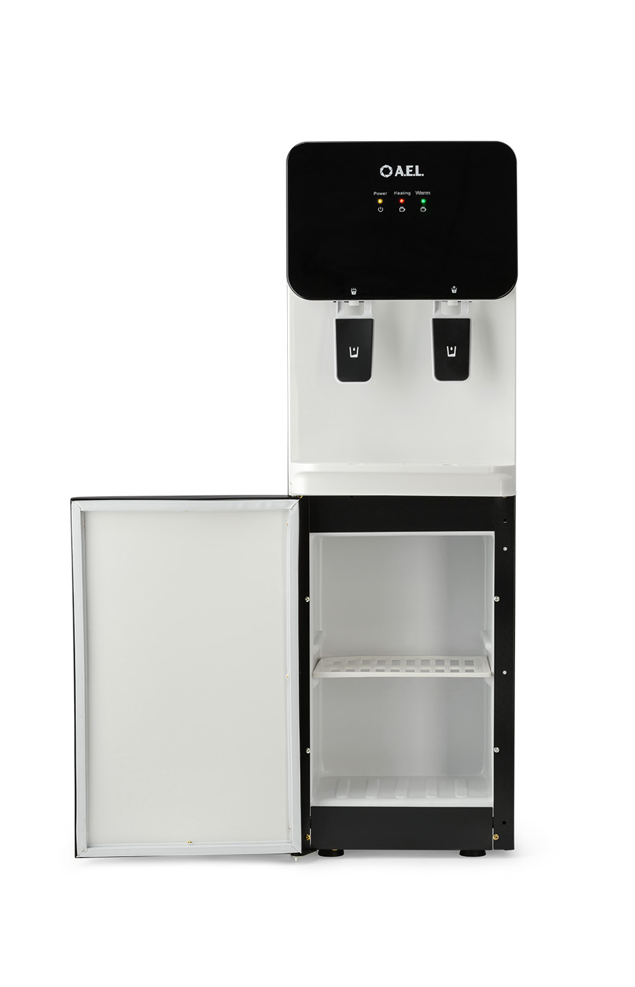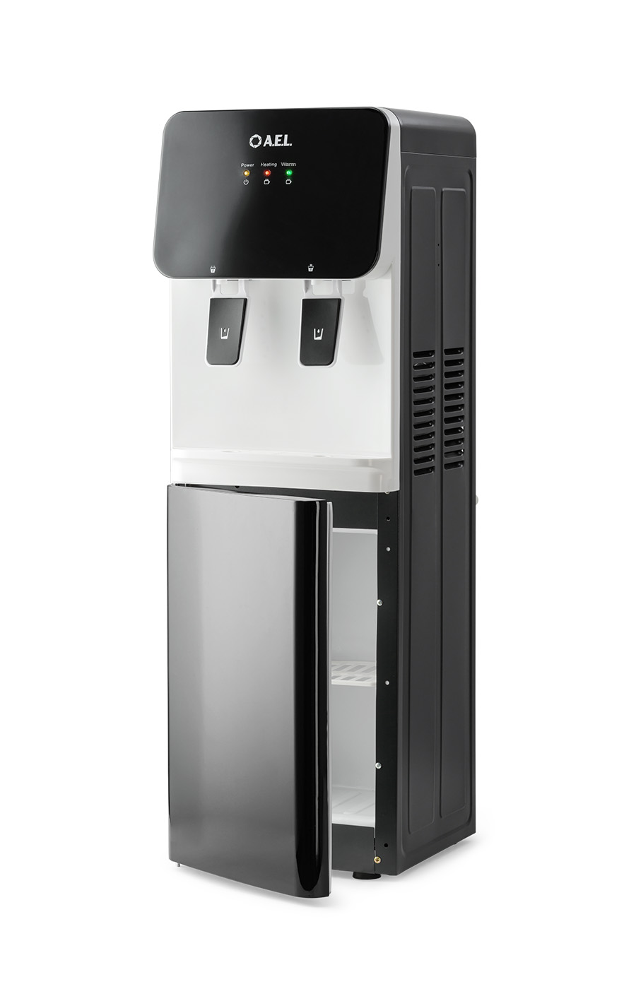 Напольный кулер без охлаждения, нагревом и шкафчиком для продуктов. Гладкая черная лицевая панель, удобные краны "нажим чашкой" и малые габариты этого аппарата эргономично впишутся в Ваш офис. Цвет черный с белой вставкой.